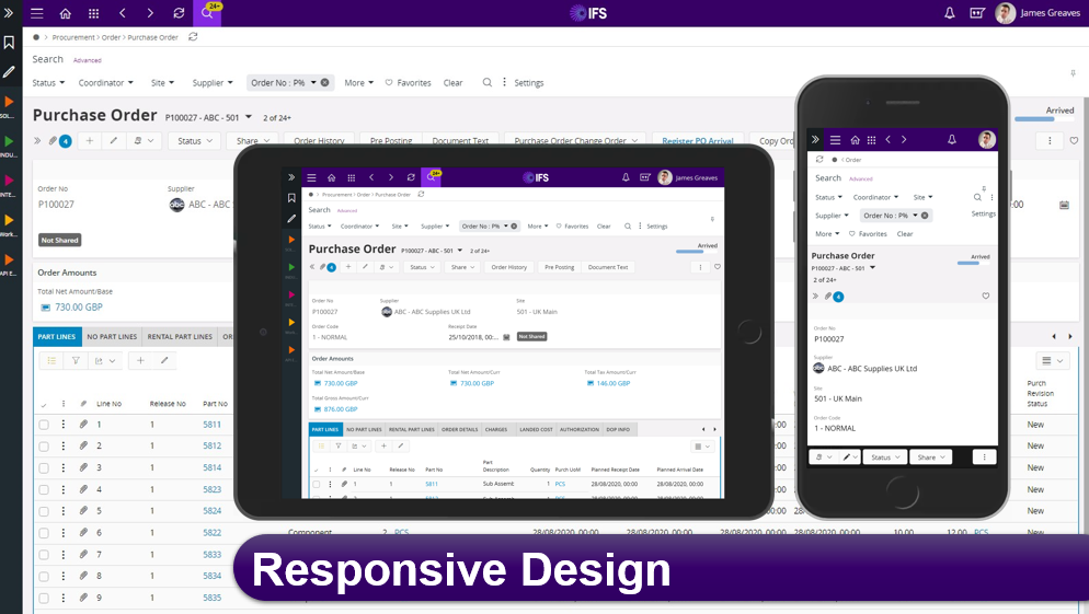 IFS is a truly mobile responsive user interface with the screen layouts automatically updating based on the device and orientation you are using. This includes navigation and selection options.